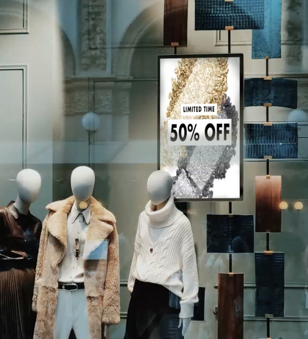 Écrans vitrine haute luminosité : Conçus pour être visibles en plein jour, même en extérieur. Ils permettent de capter l’attention des passants et d’afficher des messages percutants.