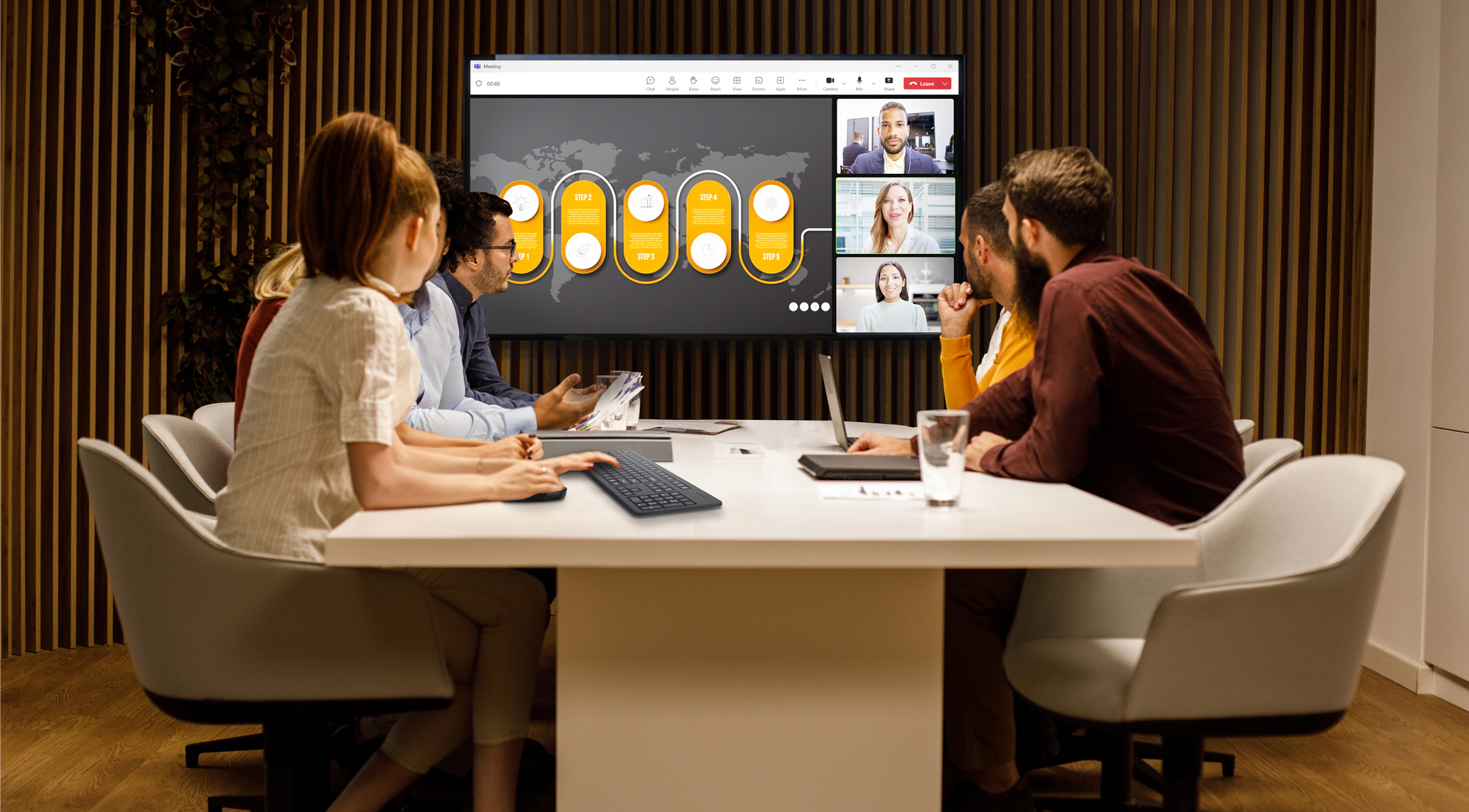 Profitez de différentes options pour ajouter des outils audio/vidéo adaptés à la taille de votre salle : caméras 4K, micros longue portée et haut-parleurs professionnels. Pour Écrans sur mur ou sur pied.